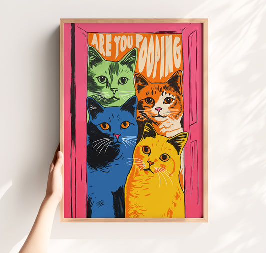 Are You Pooping Funny Cat Poster - Retro Colorful Bathroom Wall Art - Quirky Maximalist Matte Print
