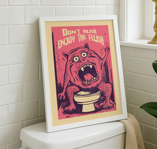 Don't Rush Enjoy The Flush Monster Poster - Retro Pink Bathroom Wall Art - Quirky Weirdcore Matte Print